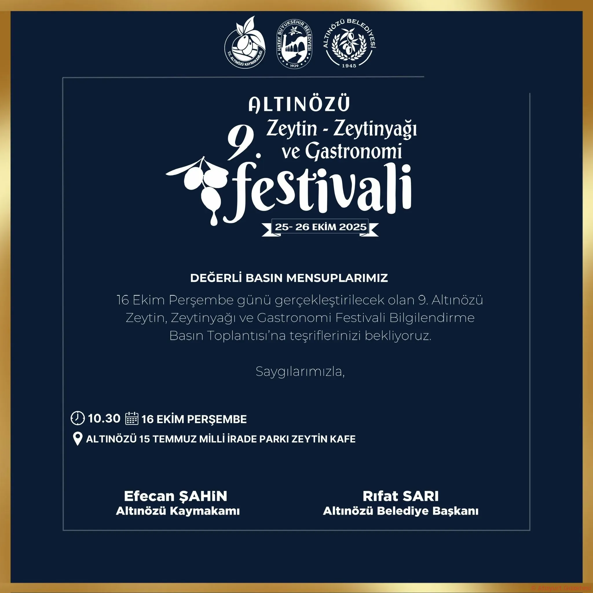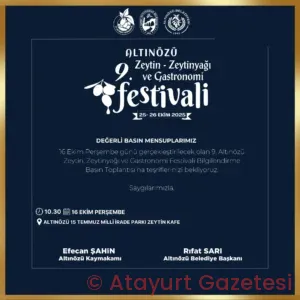 Hatay’ın Altınözü Belediyesi tarafından geleneksel hale getirilen ve bu yıl 9. Düzenlenecek Altınözü Zeytin, Zeytinyağı ve Gastronomi Festivaliyle ilgili Bilgilendirme toplantısı yarın yapılacak.