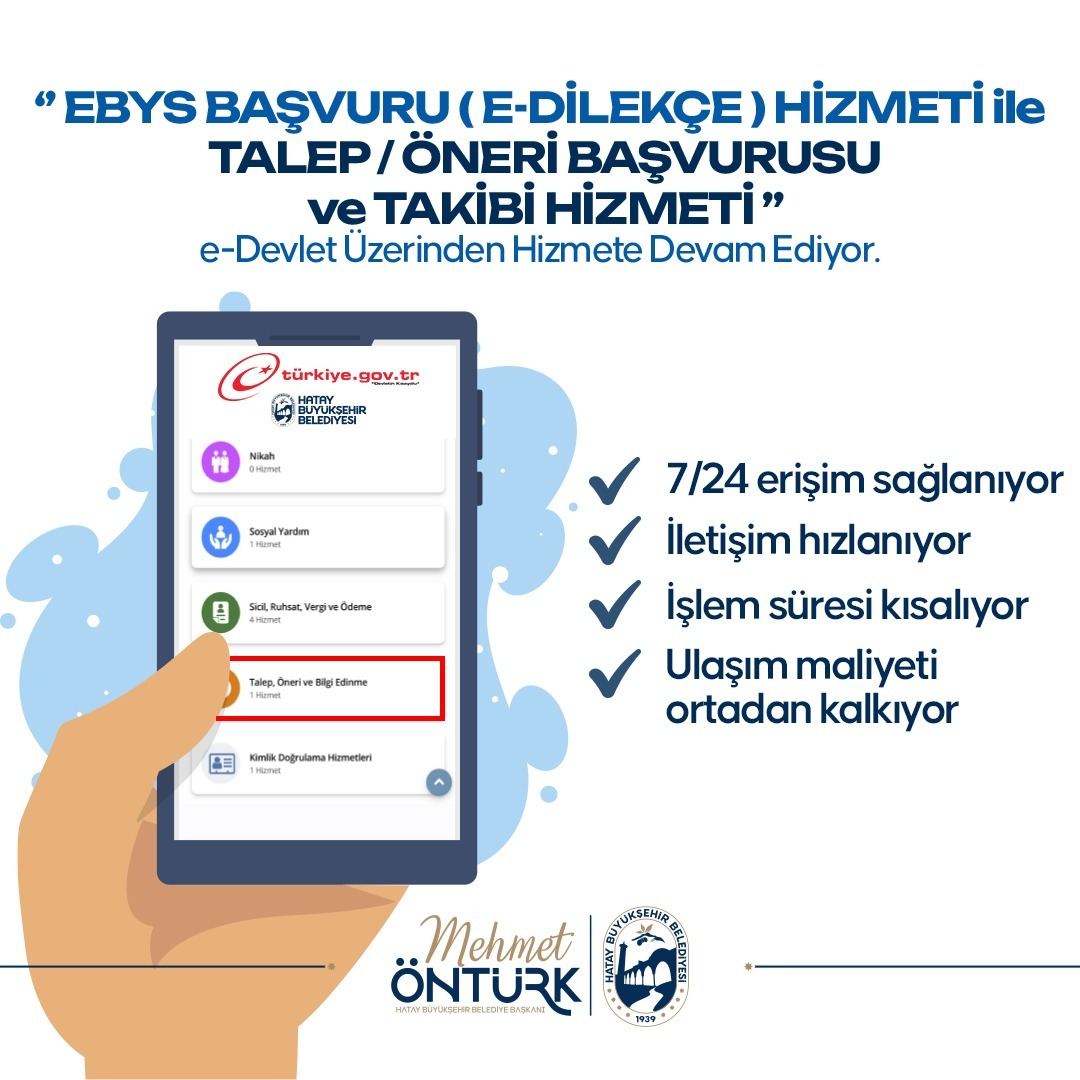 Hatay Büyükşehir Belediyesi’nden yapılan açıklamada vatandaşların Elektronik Belge Yönetim Sistemi (EBYS) modülüne e-Devlet üzerinden e-dilekçe ile ulaşılabileceği hatırlatıldı.