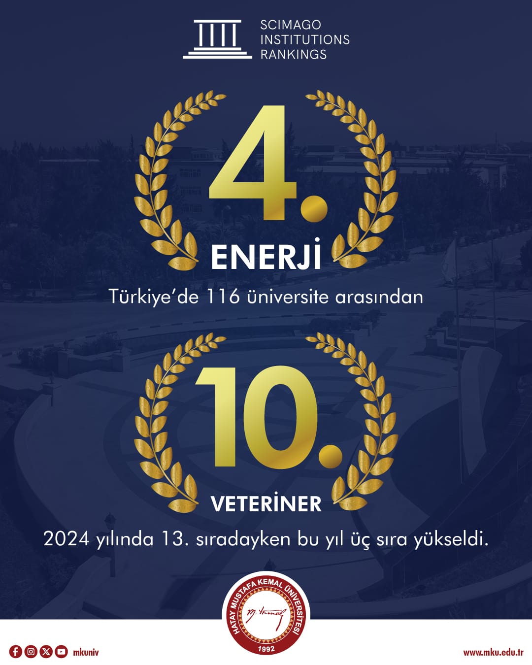 Ayrıca Mustafa Kemal Üniversitesi, SCImago Veterinerlik alanı sıralamasında 2024 yılında 13. sıradayken bu yıl üç sıra yükselerek 10. sırada yer almayı başardı.
