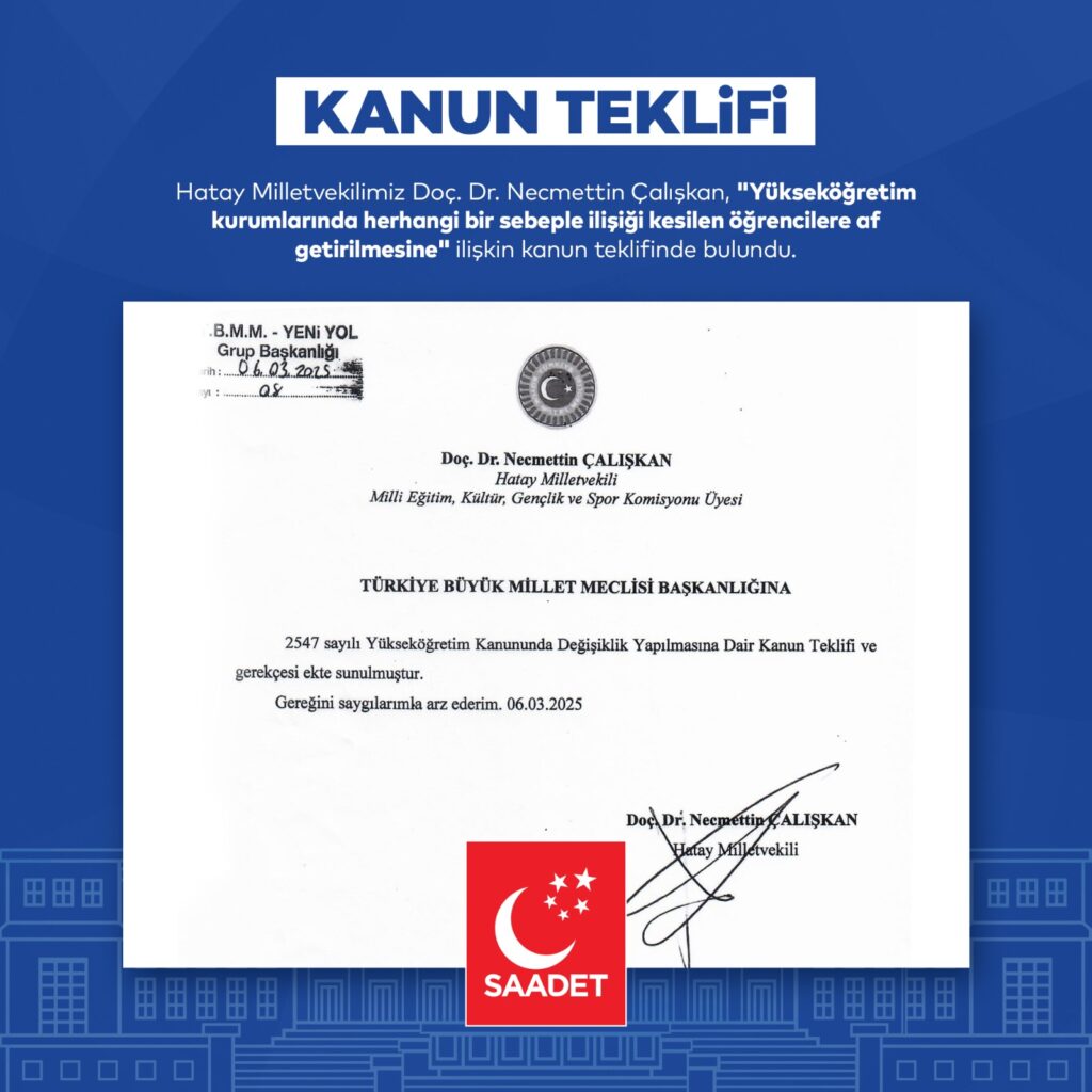 Saadet Partisi Hatay Milletvekili Doç. Dr. Necmettin Çalışkan, deprem, pandemi ve mali krizler nedeniyle eğitimini yarıda bırakmak zorunda kalan ön lisans, lisans, yüksek lisans ve doktora öğrencilerinin eğitim haklarını geri kazanmaları için TBMM’ye Kanun Teklifi sundu.