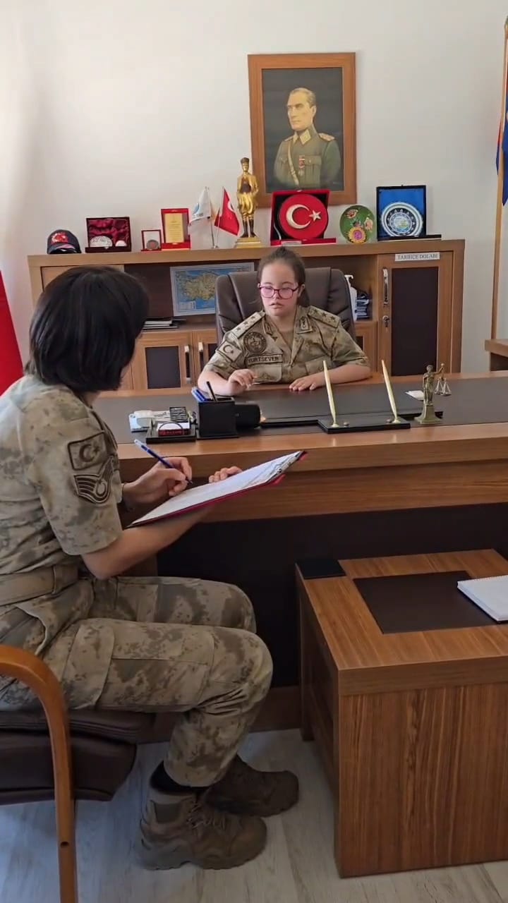 “Down sendromlu özel evladımız Fatma, en büyük hayalini gerçekleştirerek Jandarma üniformasını giydi. Fatma, personelimizle birlikte devriye görevine katıldı, vatandaşlarımızı ziyaret etti ve “KADES” uygulamasını tanıtarak “Kadına El Kalkamaz” broşürlerini dağıttı.