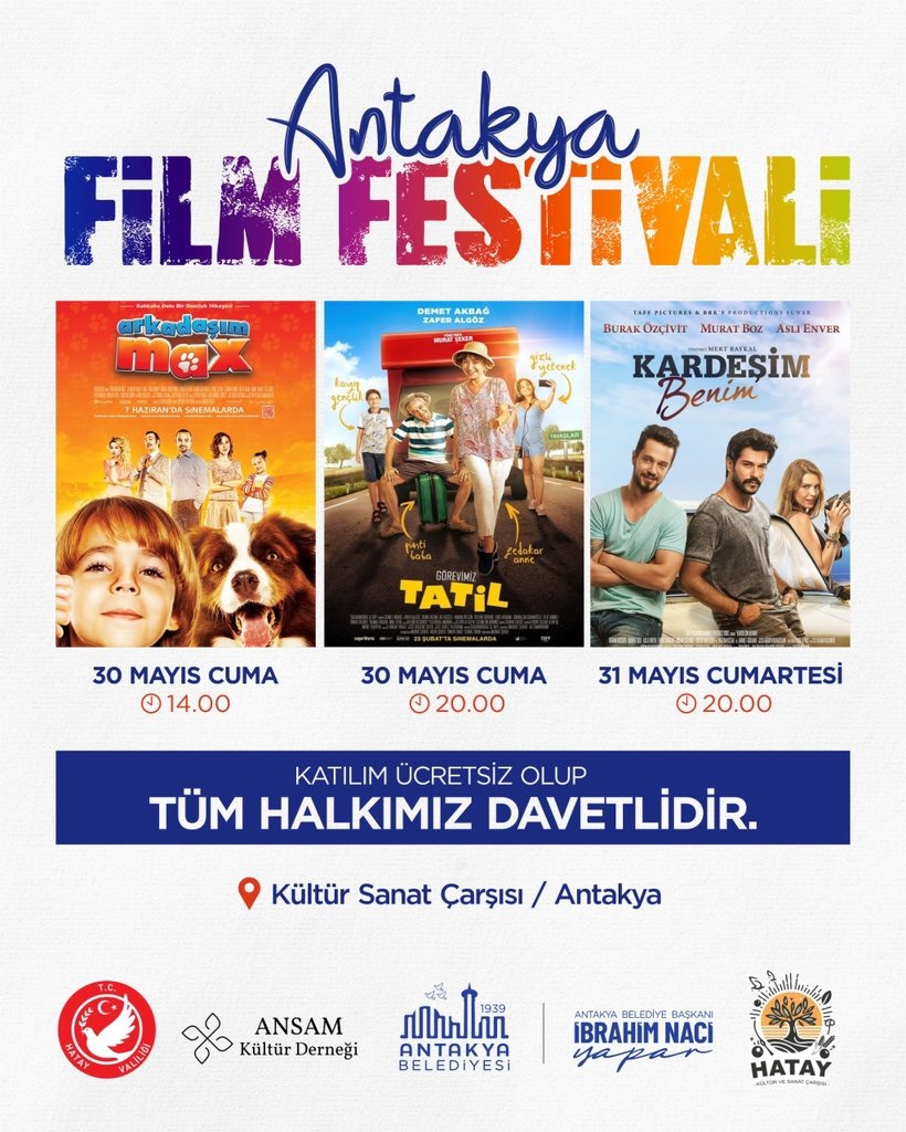 Antakya Belediyesi’nden yapılan açıklamada; Hatay Valiliği, Ansam Kültür Derneği iş birliğiyle Defne Kültür Sanat Çarşısı’nda gerçekleştirilecek olan Antakya Film Festivali’nin ücretsiz olacağı belirtildi. Açıklamada; 30 Mayıs Cuma Günü saat 14.00’te gösterime girecek olan ‘Arkadaşım Max’ ve saat 20.00’de ‘Görevimiz Tatil’, 31 Mayıs Cumartesi günü saat 20.00’de ‘Kardeşim Benim’ adlı filmlere tüm sinemaseverler davet edildi.