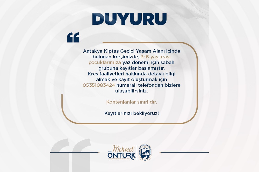 Hatay Büyükşehir Belediyesi Sağlık ve Sosyal İşler Dairesi Başkanlığı, Antakya Gülderen Mahallesi’nde yer alan Kiptaş Geçici Yaşam Alanı içinde hizmet veren kreş için, 3-6 yaş arası çocuklara yönelik yaz dönemi sabah grubu kayıtlarını almaya başladı.