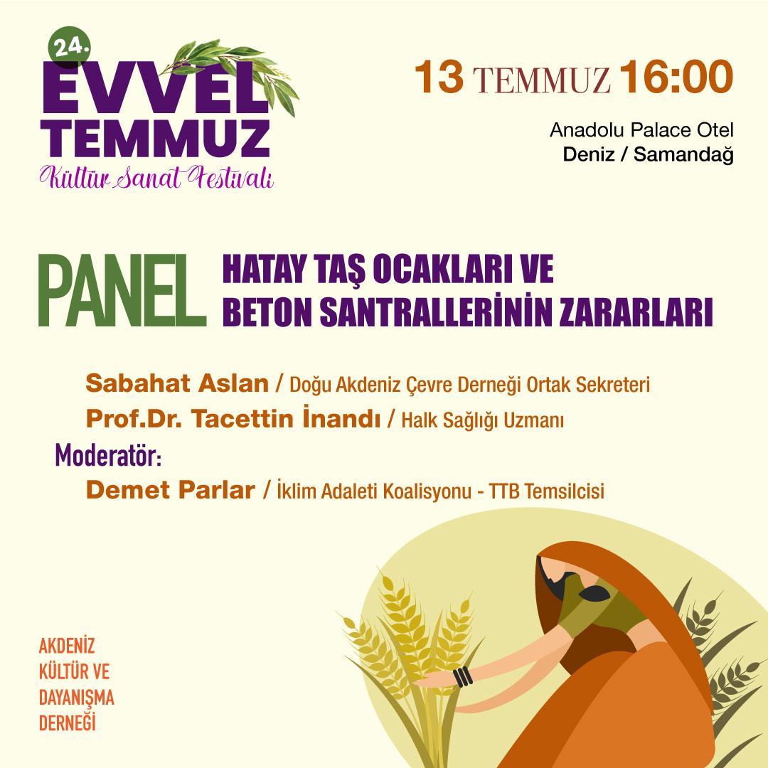 Hatay’ın Samandağ ilçesinde her yıl düzenlenen Evvel Temmuz Festivali etkinlikleri çerçevesinde “Hatay Taş Ocakları ve Beton Santrallerinin zararları” paneli düzenlendi.