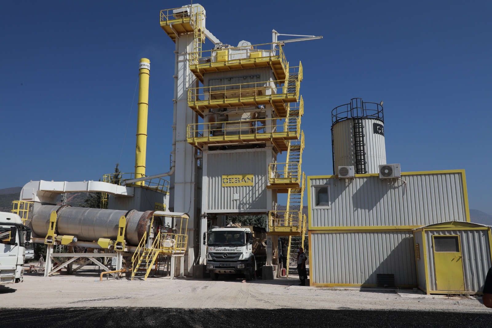 Hatay Büyükşehir Belediyesi’nin kendi imkânları ve personeli ile yürüttüğü bakım onarım çalışmalarının ardından faaliyetlerine tekrar başlayan şantiye saatte 160 ton asfalt üretim kapasitesine sahip.