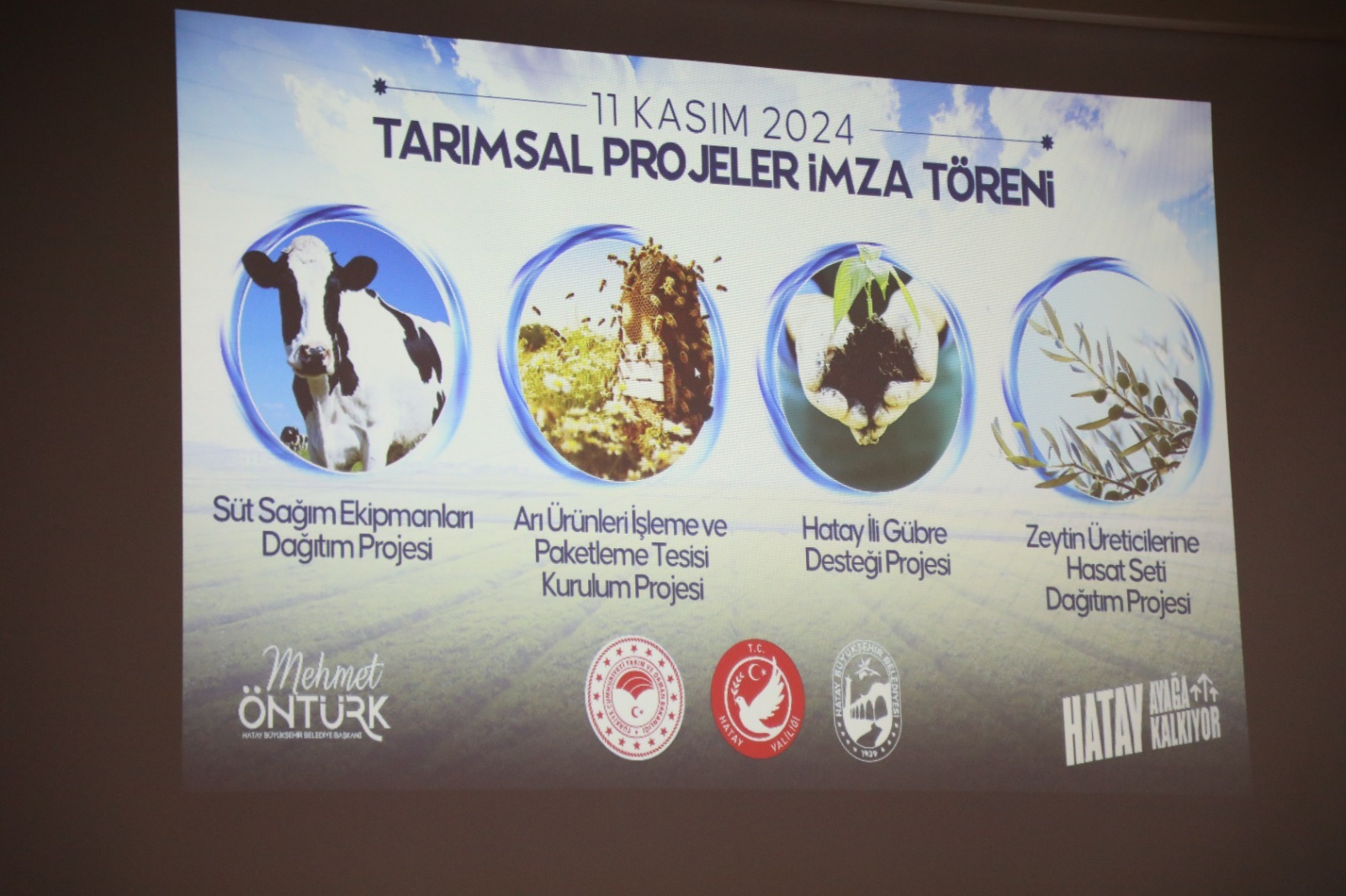 Hatay Büyükşehir Belediyesi Tarımsal Hizmetler Dairesi Başkanlığı, Hatay Valiliği, Tarım ve Orman İl Müdürlüğü; süt sağım ekipmanları dağıtımı, arı ürünleri işleme tesisi, gübre dağıtım desteği ve zeytin üreticilerine hasat seti dağıtımı gibi projelerle Hatay’da tarımsal üretimin ve çiftçinin ayağa kalkmasını hedefliyor.