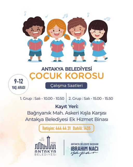 Antakya Belediyesi’nden yapılan açıklamada; 9–12 yaş arası çocuklar için hazırlanan Çocuk Korosu’nun çocukların hem yeteneklerini keşfetmek hem sosyal aktivitelerde bulunmalarını sağlamak için başlayacağı belirtildi. Katılmak isteyenlerin Bağrıyanık Mahallesi Kışla Karşısı’nda bulunan Antakya Belediyesi Ek Hizmet Binası’na gelerek ya da 444 44 31 | Dahili: 1435 No’lu telefonlardan detaylı bilgi alabilecekleri belirtildi.