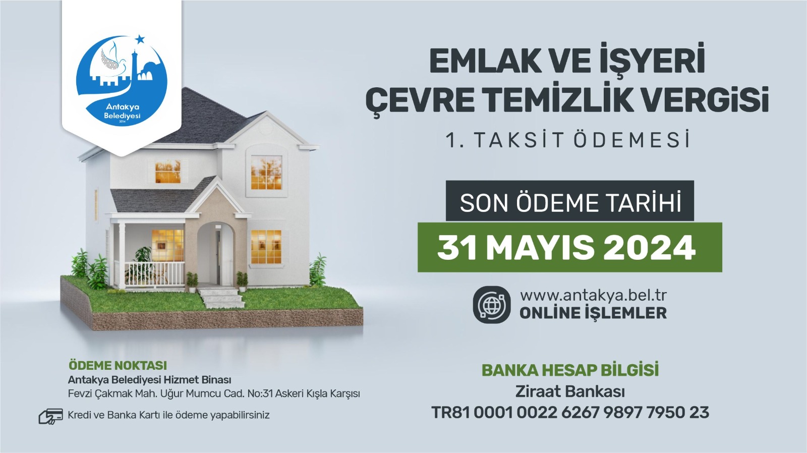 Antakya Belediyesi, Emlak ve Çevre Temizlik Vergileri’nin birinci taksiti için son ödeme tarihinin 31 Mayıs 2024 günü olduğunu duyurdu.