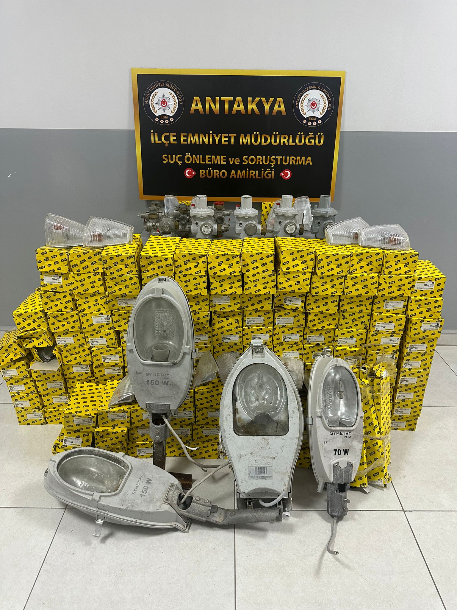 Hatay Valiliğinden yapılan açıklamada, Hatay Emniyet Müdürlüğü görevlilerince Hırsızlık suçlarına yönelik yapılan çalışmalar kapsamında 30.04.2024 günü Antakya Narlıca mahallesinde bir işyerinde yapılan aramada; 193 adet araç sinyal ve far lambaları, 8 adet AKSA gaz şirketine ait regülatör ile 4 adet TEDAŞ’a ait sokak lambası ele geçirildiği belirtildi.