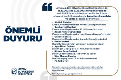 Hatay Büyükşehir Belediyesi, alt yapı çalışmaları kapsamında 13 Aralık 27 Aralık tarihlerinde arasında Asfalt çalışmalarından dolayı 9 caddenin trafiğe kapatılacağını belirtti. Hatay Büyükşehir Beledi...