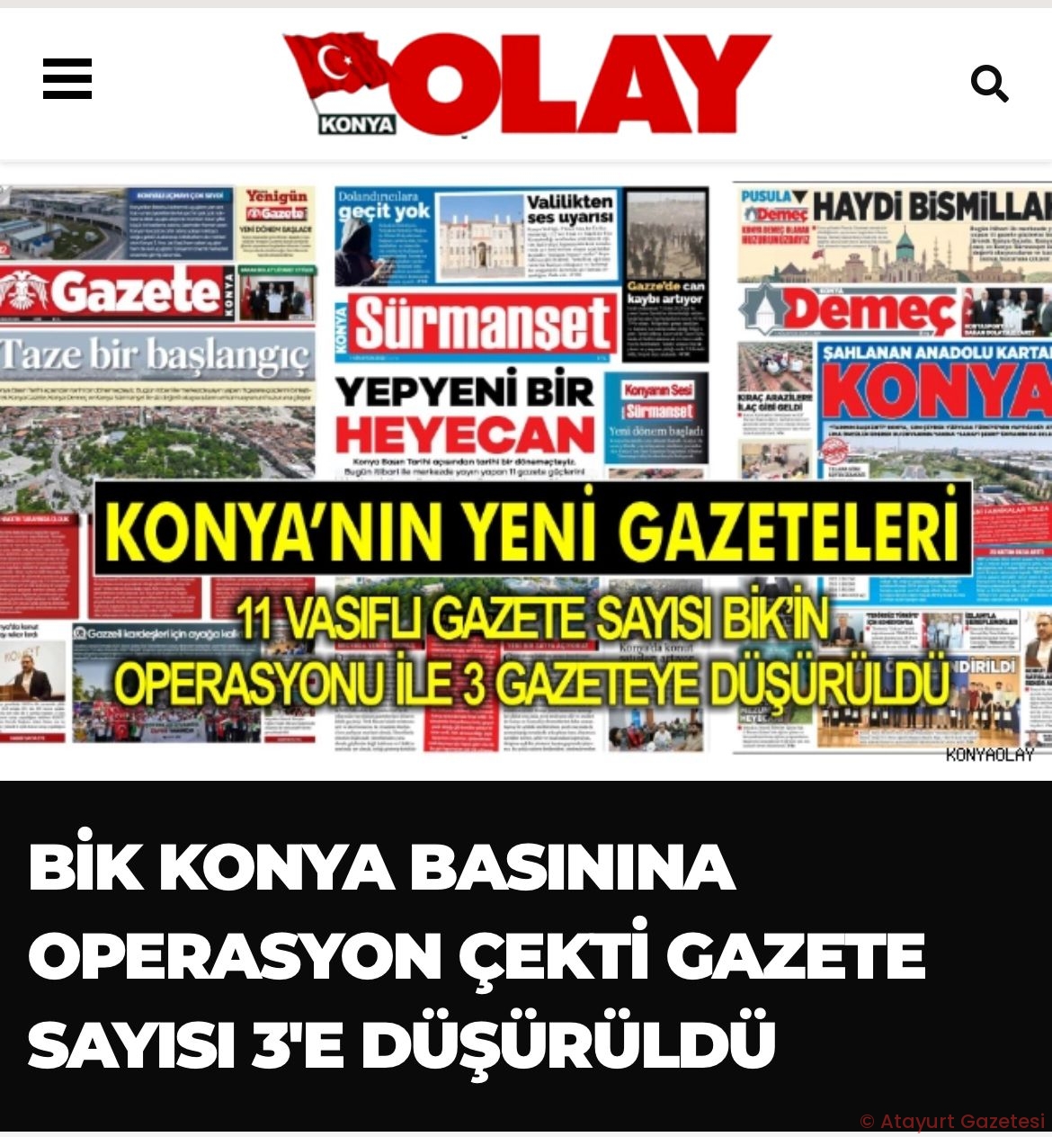 Konya Olay TV’nin Haberine göre, Konya’da yıllardır Gazetelerin birleşti, birleşiyor beklentisi sonuç verdi ve 11 Gazetenin yerine 1 Ağustos 2025 tarihi itibari ile 3 Gazete vasıflı olarak yayınlanmaya başladı.
