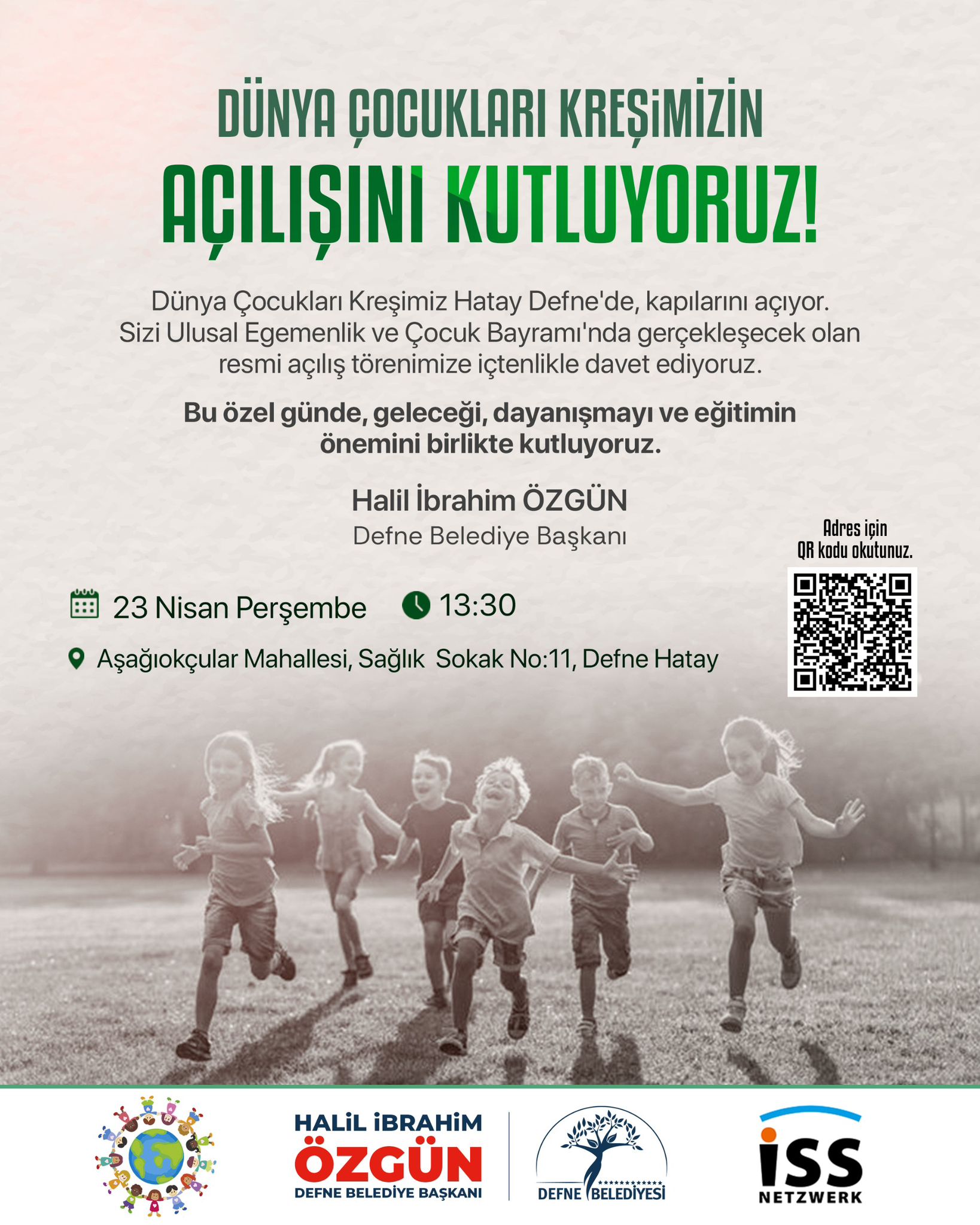 Defne Belediye Başkanı Sayın Halil İbrahim Özgün, 23 Nisan Ulusal Egemenlik ve Çocuk Bayramı’nda, Dünya Çocukları Vakfı ve ISS Netzwerk iş birliğiyle ilçeye kazandırılan Dünya Çocukları Kreşi’nin açılışının gerçekleştirileceğini duyurarak tüm vatandaşları bu anlamlı törene davet etti.