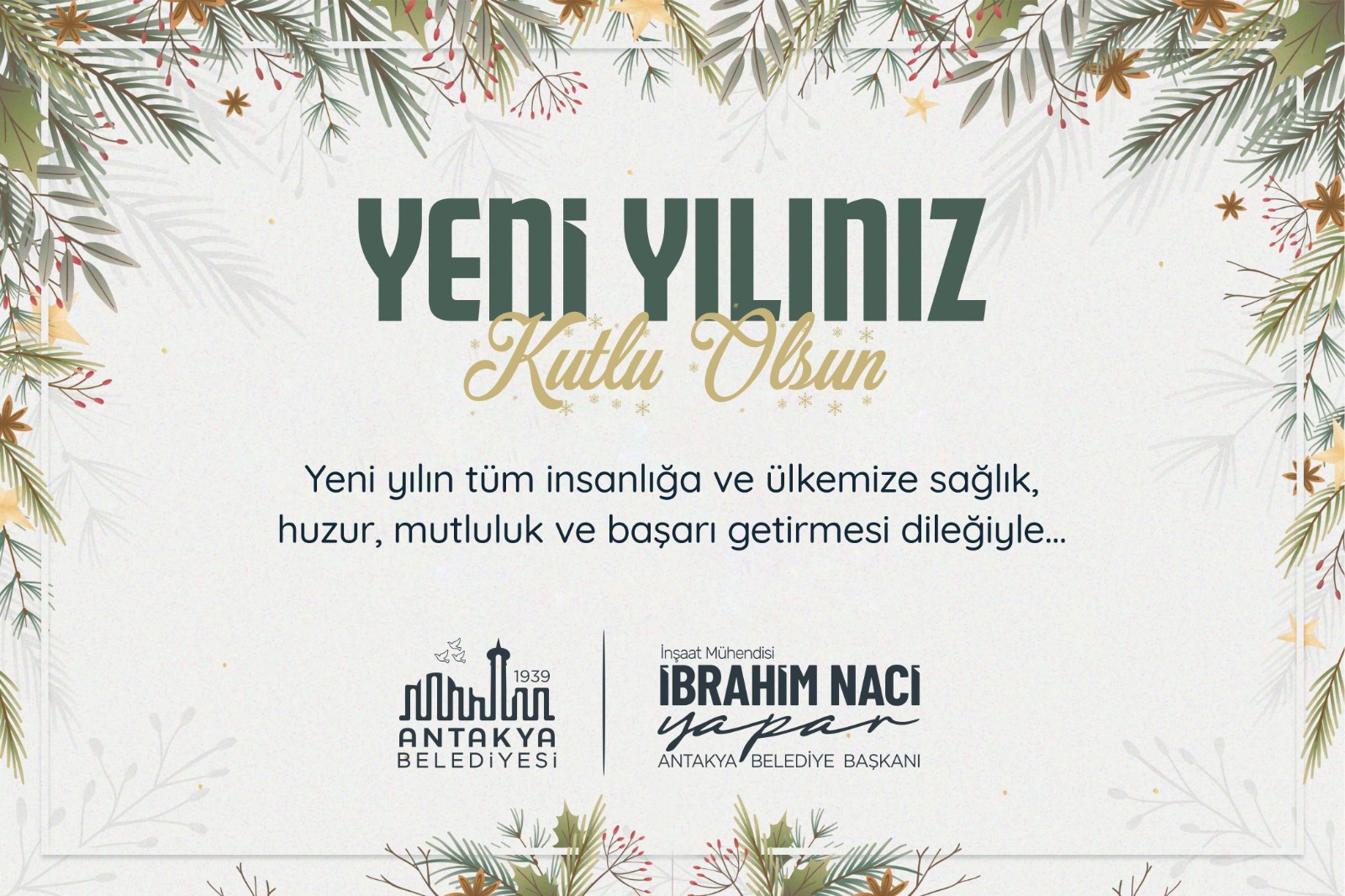 Antakya Belediye Başkanı İbrahim Naci Yapar yeni yıl dolayısıyla yayımladığı mesajında: “Yeni yılınızı en içten dileklerimle kutluyor; aileniz ve sevdiklerinizle mutlu, huzurlu, sağlıklı ve umut dolu bir yıl geçirmenizi temenni ediyorum.