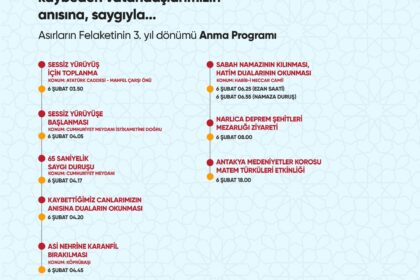 Hatay Büyükşehir Belediyesi, 6 Şubat Depremlerinin 3. Yıl etkinlikleri dolayısıyla, Antakya’da Trafik yönünden bazı düzenlemeler yapıldığını belirtti. Hatay Büyükşehir Belediyesi, 5 ve 6 Şubat günleri...