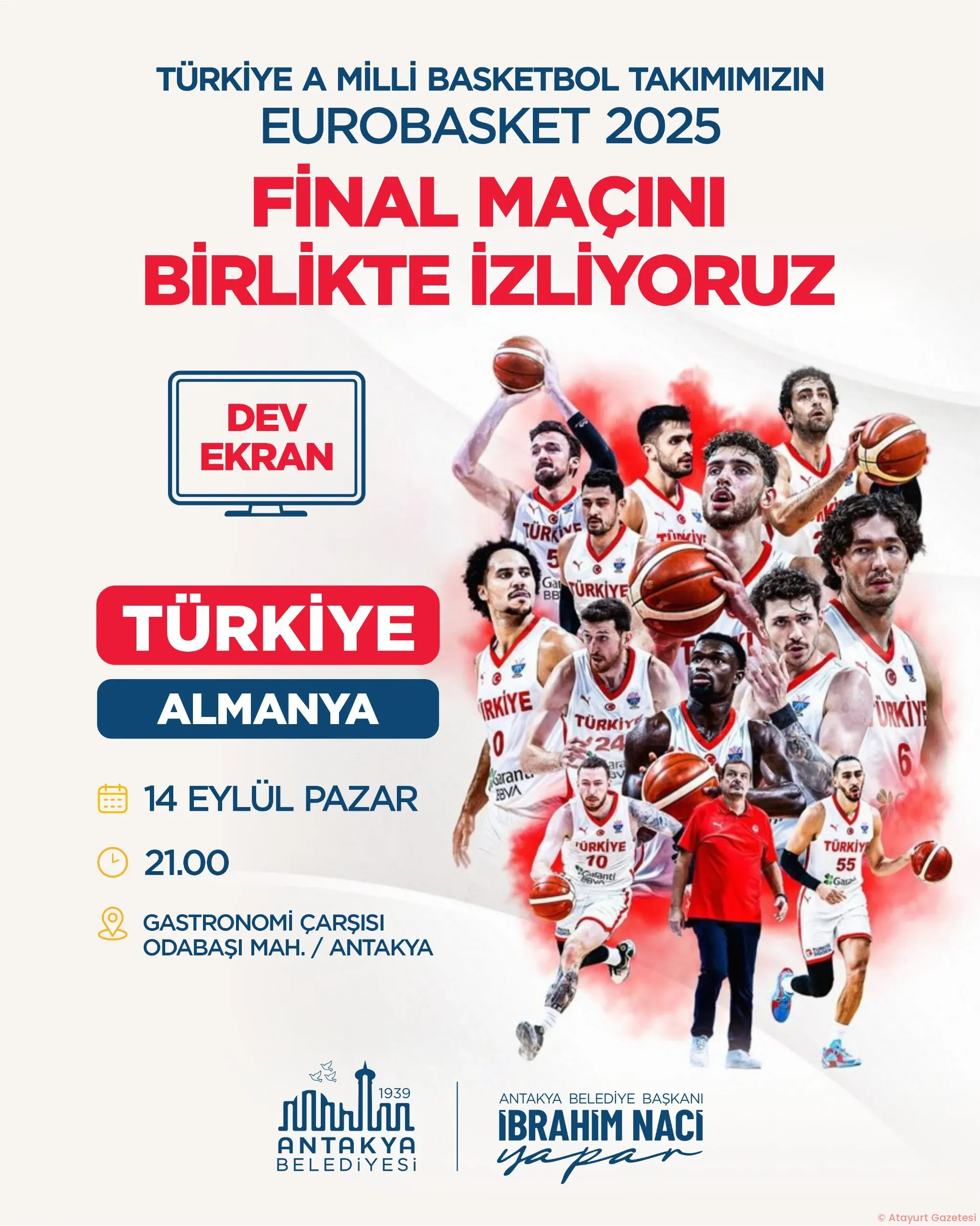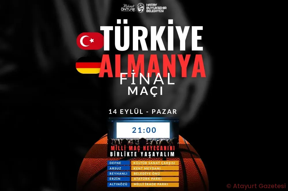 Hatay Büyükşehir Belediyesi, A Milli Basketbol Takımımızın Avrupa Basketbol Şampiyonası’nda Almanya ile oynayacağı final karşılaşmasını 5 ilçede kuracağı dev ekranlarda canlı yayınlayacak. Vatandaşlar...