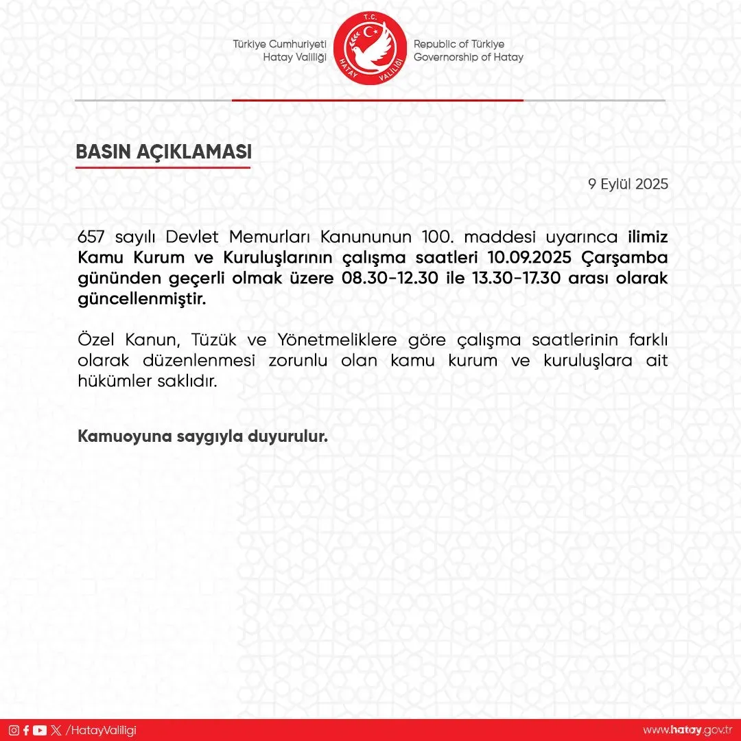 Hatay Valiliği, Resmi Kurumlarda mesai saatlerinin değiştiğini duyurdu. Hatay Valiliği yeni dönemde mesai saatlerinin sabah saat 8.30-12.30 ile 13.30-17.30 olarak değiştirildiğini açıklamasında belirt...