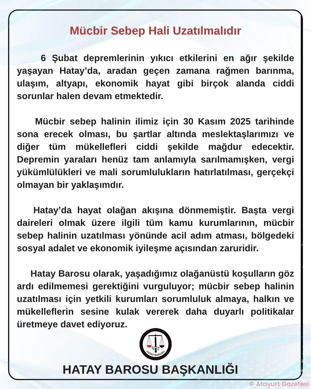 Hatay Barosu, Mucbir sebep halinin uzatılmasını istedi. Hatay Barosundan yapılan açıklamada, Hatay’da hayatın olağan akışına dönmediğine dikkat çekilerek şu ifadelere yer verildi: “6 Şubat depremlerin...