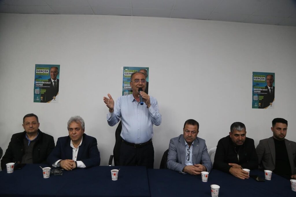 İbrahim Naci Yapar ilk olarak AK Parti Hatay Milletvekili Av. Adem Yeşildal, AK Parti Hatay İl Başkanı Dr. Mustafa Erdoğan, Hatay Büyükşehir Belediye Başkan adayı Mehmet Öntürk ve Cumhur ittifakı teşkilatları ile birlikte, Memur-Sen İl Başkanı İsmail Bayrakdar ve üyeleriyle bir araya geldi.