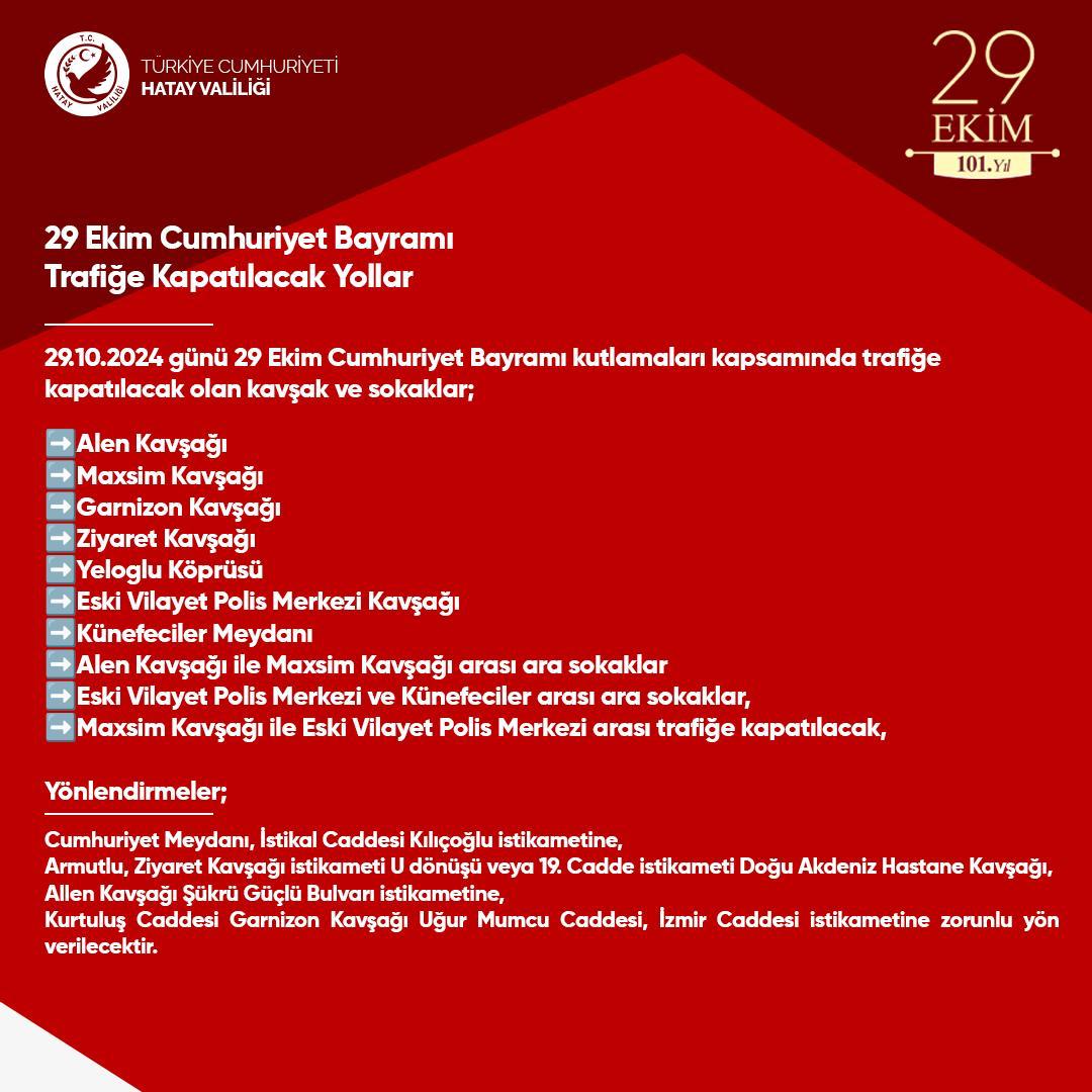 Hatay Valiliği, Cumhuriyetimizin kuruluşunun 101. Kutlama törenleri dolayısıyla Antakya’da trafiğe kapatılacak yolları açıkladı.