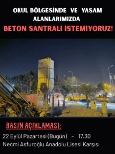 Antakya Çevre Koruma Derneği, “Okul bölgesinde ve Yaşam alanlarımızda Beton Santral istemiyoruz” çağrısı yaparak, Bugün saat 17.30 da Necmi Asfuroğlu Anadolu Lisesi’nin karşısında Basın açıklaması yapacaklarını duyurdu.