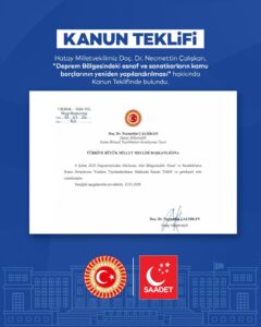 Saadet Partisi Hatay milletvekili Doç. Dr. Necmettin Çalışkan, depremden etkilenen tüm illerdeki esnaf, sanatkâr ve iş dünyasını kapsayan, bölgesel ekonomiyi ayağa kaldırmayı hedefleyen kanun teklifini Meclis Başkanlığına sundu. Hatay Ticaret ve Sanayi Odası başta olmak üzere bölgedeki meslek kuruluşlarının taleplerini yasama gündemine taşıyan teklif, bölgedeki ticari hayatın devamlılığı için hayati önem taşıyor.