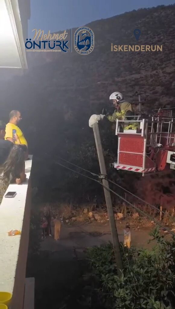 İtfaiye ekipleri tarafından yürütülen çalışmada İskenderun ilçesi Modernevler Mahallesi’nde telefon direğinde mahsur kalan kedi, özverili çalışmayla kurtarıldı.