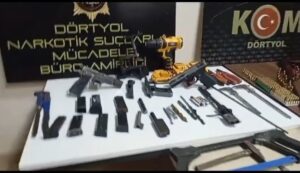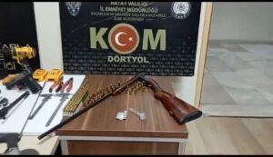Hatay Valiliğinden konuya ilişkin yapılan açıklamada, Hatay Emniyet Müdürlüğü görevlilerince kaçakçılık olaylarına yönelik yapılan çalışmalar kapsamında Dörtyol Yeşilköy Mahallesinde bulunan bir ikamette yapılan aramada; Daralı ağırlığı 0.35 gr metamfetamin maddesi, 1 Adet Ruhsatsız tabanca,1 adet kurusıkı tabanca, 1 adet av tüfeği, 9 adet şarjör, 4 adet namlu, 1 adet silah gövdesi, 1 adet sürgü, 8 adet icra yayı, 142 adet fişek, 1 adet mengene, 2 adet kumpas, 3 adet keski, 1 adet matkap, 1 adet spiral makinası ile 31 adet silah yapımında kullanılan malzeme ele geçirildiği belirtildi.