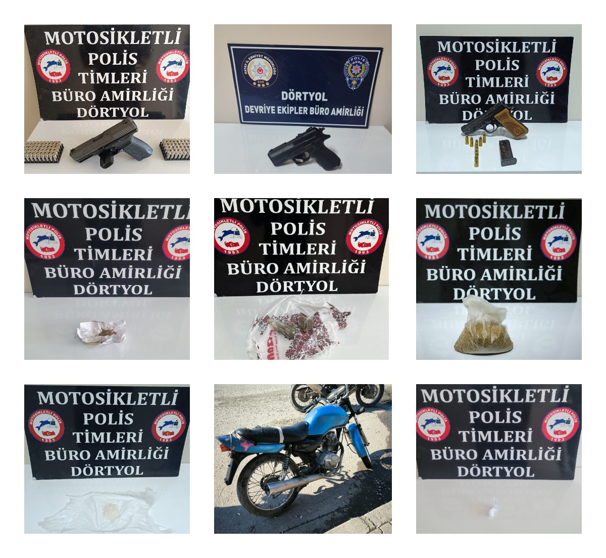 Hatay Valiliğinden yapılan açıklamada, Hatay Emniyet Müdürlüğü görevlilerince Dörtyol İlçesi genelinde şüpheli şahıslar ve araçlar üzerinde yapılan uygulamada; 3 Adet Ruhsatsız Tabanca,