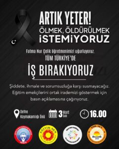 İstanbul’da bir Lisede bir öğrenci tarafından öldürülen Öğretmenle ilgili olarak Antakya’da Eğitim-İş, TÖB-SEN, Eğitim-Sen ile Öğretmenler Sendikası bugün Basın açıklaması yapacaklar.