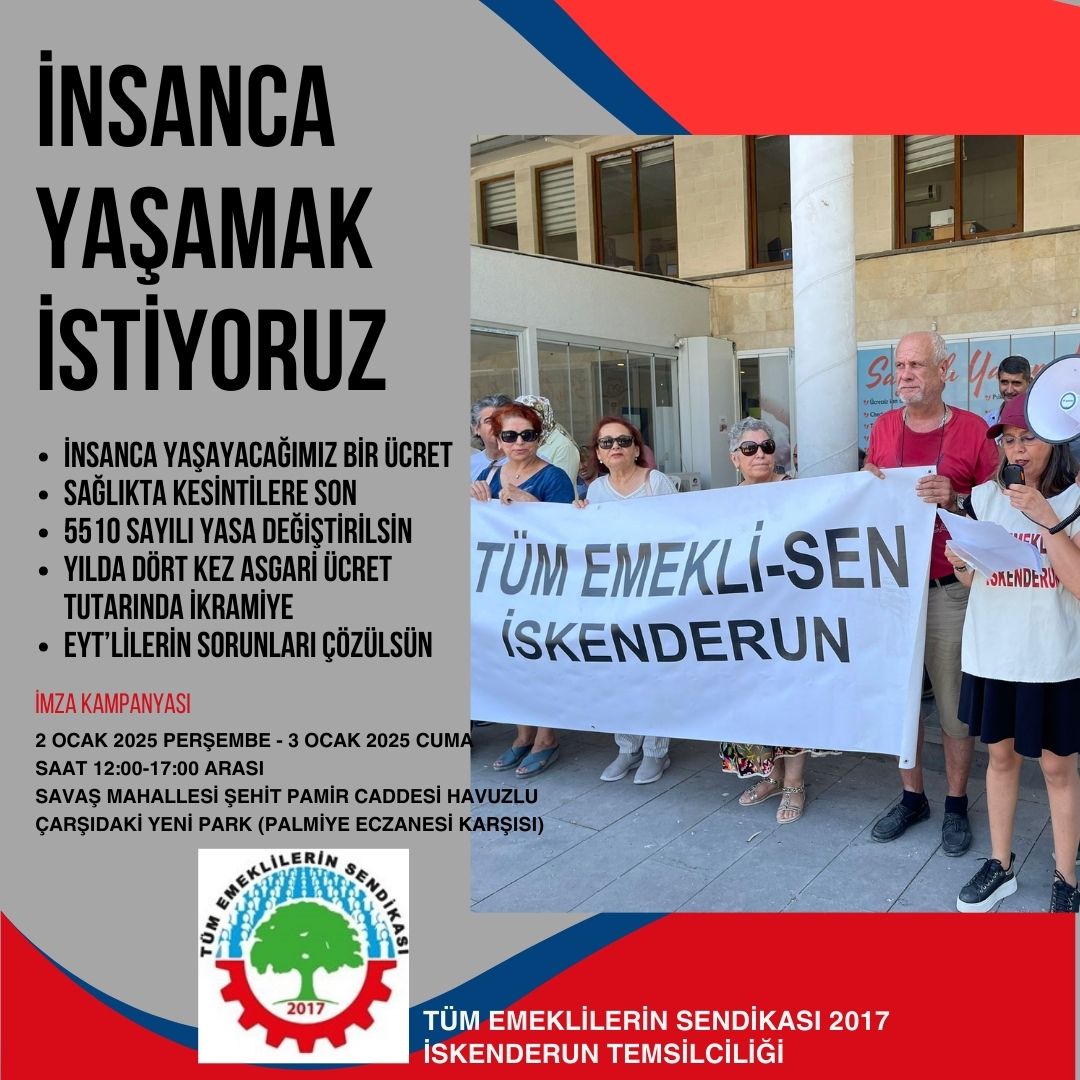Sendika hakkımızı gasp etmekten vazgeçin. Sağlık kolay erişilebilir ve tamamen parasız olmalıdır. Memurlara verilen ve hakkımız olan seyyanen ödemeyi emeklilerden sakınmayı bırakın. Anlaşılan 2025 sıcak geçecektir. Biz bu rezil duruma teslim olamayız. Yani açlığa alışmayacağız. Bizi susturmak için nafile çırpınışlarınız olacaktır ama; bizim kaybedecek bir şeyimiz kalmadı. Sefalete teslim olmayacağız. Sonuna kadar direneceğiz! Bizler, yani Tüm Emeklilerin Sendikası üyeleri, kral sofrasında soytarı olmaktansa, sınıfımızın insanca yaşam ve demokrasi mücadelesinde yalın ayak yürümeyi onur sayarız.