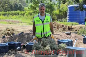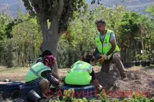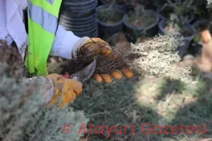 Yapılan çalışmalarda bölgedeki bitki örtüsü ve çim alanlar özenle sökülerek zarar görmemesi için Hatay Büyükşehir Belediyesi üretim alanına saksılanarak taşınıyor.