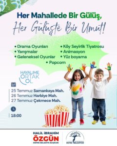 Drama ve geleneksel oyunlardan yüz boyamaya, köy seyirlik tiyatrosundan animasyon gösterilerine, yarışmalardan patlamış mısıra kadar dopdolu içerikleriyle bu etkinlikler, çocuklara unutulmaz bir yaz yaşatmayı hedefliyor” ifadesinde bulunuldu..