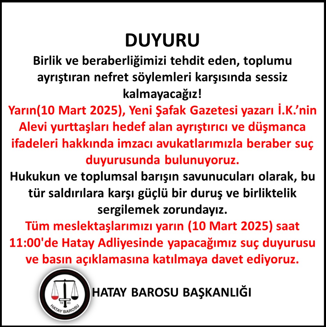 Hatay Barosundan yapılan açıklamada, Yeni Şafak Gazetesi Yazarı İsmail Kılıçarslan’ın 8 Mart 2025 tarihli yazısında, Alevi Vakandaşları hedef alan ayrıştırıcı ve düşmanca ifadeler hakkında 10 Mart Pazartesi günü (Yarın) Hatay Adliyesi’nde saat 11.00 de Baro üyelerinin katılımıyla suç duyurusunda bulunacakları ve ardından Basın açıklaması yapılacağı ifade edildi.
