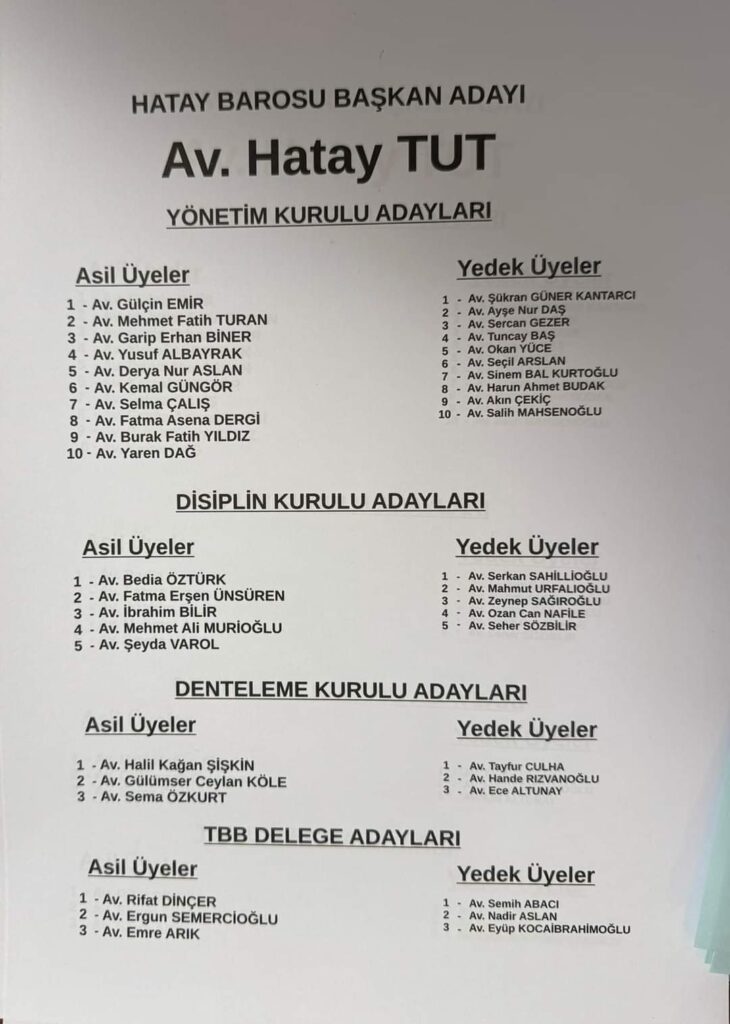 Hatay Barosu’nun bugün yapılan seçiminde, Başkanlığa Av. Hatay Tut seçildi.