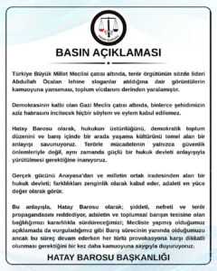 Hatay Barosu, Terörist Başı Abdullah Öcalan’ın Türkiye Büyük Millet Meclisi çatısı altında lehine sloganlar atılmasına tepki gösterdi.