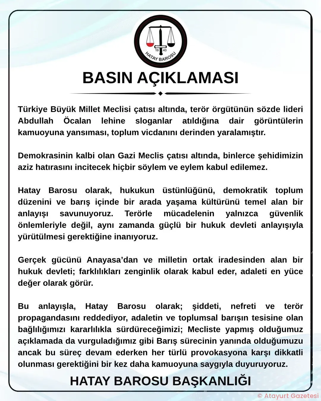 Hatay Barosu olarak, hukukun üstünlüğünü, demokratik toplum düzenini ve barış içinde bir arada yaşama kültürünü temel alan bir anlayışı savunuyoruz. Terörle mücadelenin yalnızca güvenlik önlemleriyle değil, aynı zamanda güçlü bir hukuk devleti anlayışıyla yürütülmesi gerektiğine inanıyoruz.