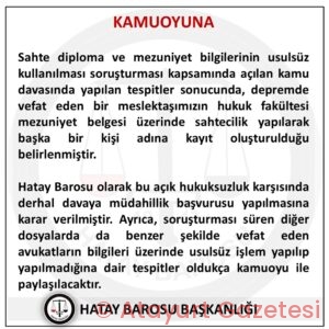 “Sahte diploma ve mezuniyet bilgilerinin usulsüz kullanılması soruşturması kapsamında açılan kamu davasında yapılan tespitler sonucunda, Depremde vefat eden bir meslektaşımızın Hukuk Fakültesi mezuniyet belgesi üzerinde sahtecilik yapılarak başka bir kişi adına kayıt oluşturulduğu belirlenmiştir.