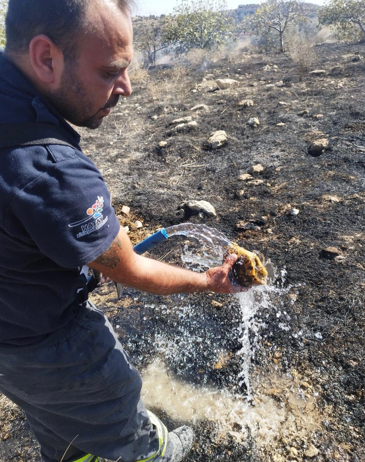 Zeytinlikte çıkan yangında alevlerin arasında kalan kaplumbağa Hatay Büyükşehir Belediyesi itfaiyesinin dikkati sayesinde hayatta kaldı.