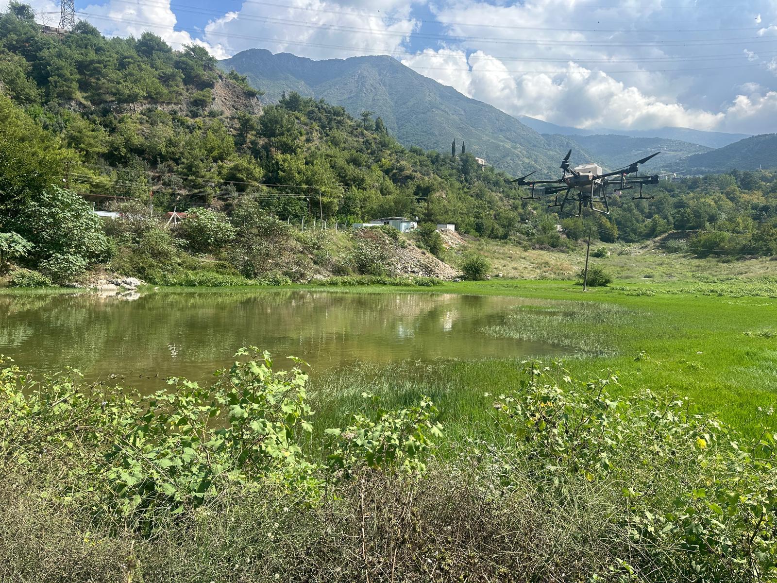 Hatay Büyükşehir Sağlık ve Sosyal Hizmetler Dairesi Başkanlığına bağlı ekipler, İskenderun Teknik Üniversitesi kampusü (İSTE) içerisinde bulunan gölet, Meydan Mahallesi, Feyezan Kanalı ile Sarıseki Mahallesindeki sazlık alanda Drone ile havadan ilaçlama çalışması başlattı.