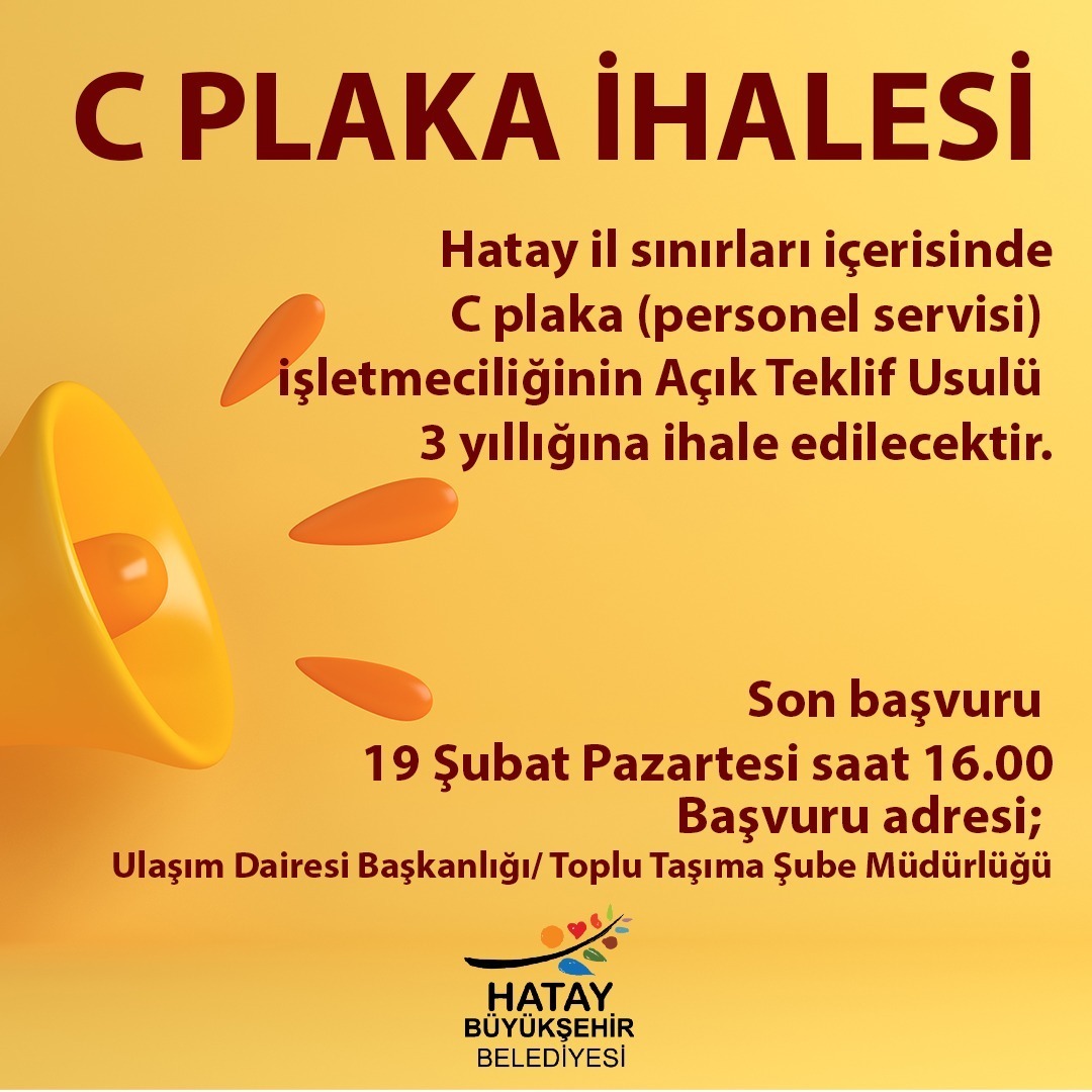 Hatay Büyükşehir Belediyesi  Hatay genelinde hizmet verecek C plaka için ihaleye çıkılacağını duyurdu.
