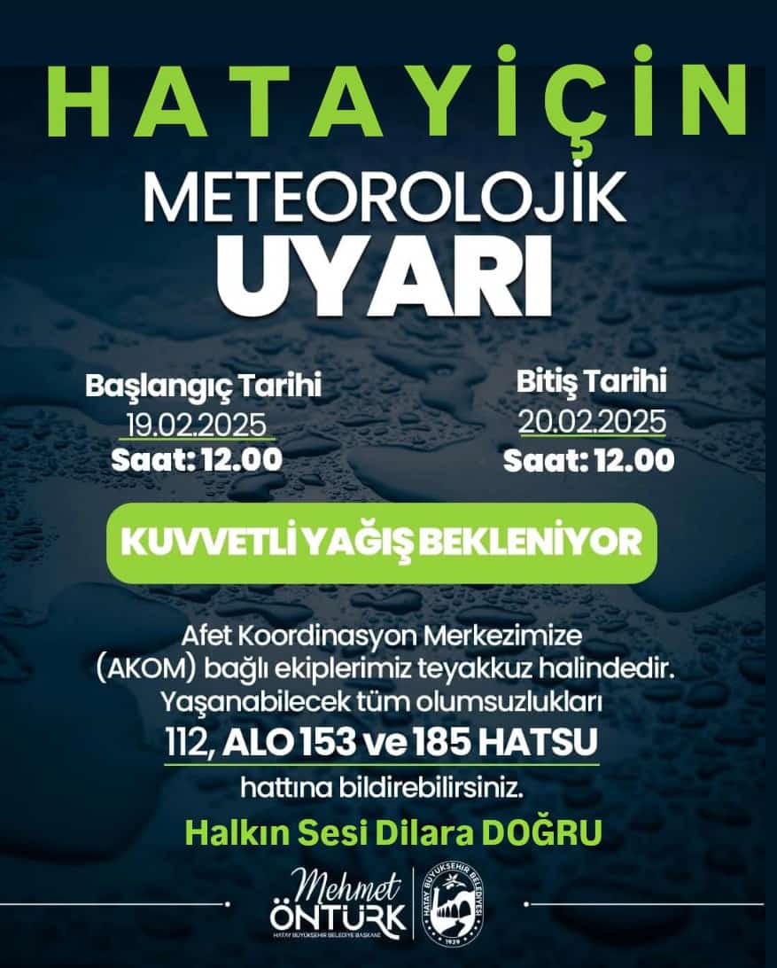 Hatay Büyükşehir Belediye Başkanı Mehmet Öztürk, tüm ekipleriyle teyakkuz halinde olduklarını ve bugün başlayacak yağışların, yarın saat 12.00 ye devam edeceği hatırlatmasında bulundu.