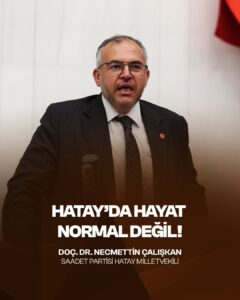 Saadet Partisi Hatay Milletvekili Necmettin Çalışkan, tüm bu sorunlar çözülmeden Hatay’da normalleşmeden söz edilemeyeceğini belirterek, deprem bölgesinde özellikle Hatay için acil ve kalıcı çözümler üretilmesi gerektiğini sözlerine ekledi.