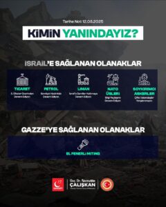 12 Ağustos 2025’te sosyal medya hesabından yaptığı paylaşımda Hatay Milletvekili Necmettin Çalışkan, İsrail’e sağlanan imkanlar ile Gazze’ye verilen desteğin karşılaştırıldığı bir tabloya yer verdi. Görselde İsrail’e yönelik maddeler şu şekilde sıralandı: