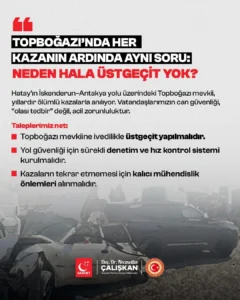 Saadet Partisi Hatay Milletvekili Doç. Dr. Necmettin Çalışkan, bölgede her geçen gün artan trafik kazalarına dikkat çekerek, “Artık yeter! İlla daha büyük acılar mı yaşanmalı?” sözleriyle yetkililere seslendi.