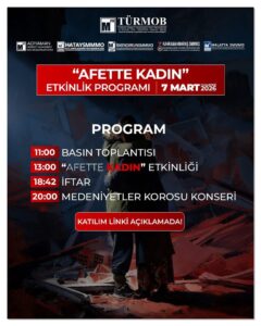 Başkan Jale Marufoğlu, 7 Mart Cumartesi günü etkinliklerin Saat 11.00 Hatay Kültür Çarşısında yapacakları Basın açıklamasıyla başlayacağını, ardından Depremin Tanıkları, Kadın Meslek Mensuplarının Gözüyle Afet oturumuyla etkinliklere Hatay Serbest Muhasebeci Mali Müşavirler Odasında devam edileceğini kaydetti.