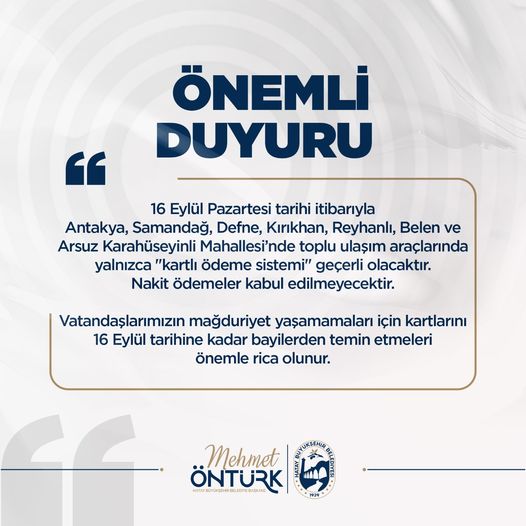 Hatay Büyükşehir Belediyesi , 16 Eylül Pazartesi tarihi itibarıyla Antakya, Samandağ, Defne, Kırıkhan, Reyhanlı, Belen ilçelerinin yanı sıra Arsuz Karahüseyinli Mahallesi’nde toplu ulaşım araçlarında nakit ödeme döneminin sona ereceğini sadece kartlı ödeme sistemine geçileceğini duyurdu.