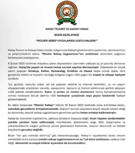“ Hatay Ticaret ve Sanayi Odası olarak, Bölgemizde faaliyet gösteren tüm üyelerimiz, işletmelerimiz ve girişimcilerimiz adına “Mücbir Sebep Uygulaması yönündeki çağrımızı kamuoyu ile paylaşıyoruz.