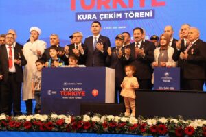 Çevre Şehircilik ve İklim Değişikliği Bakanı Murat Kurum, “Yüzyılın Konut Projesi 500 Bin Sosyal Konut” kapsamında düzenlenen “Ev Sahibi Türkiye Kura Çekim Töreni”nde yaptığı konuşmasına çekilişi yapılacak konutların hayırlar getirmesi temennisinde bulunarak başladı.