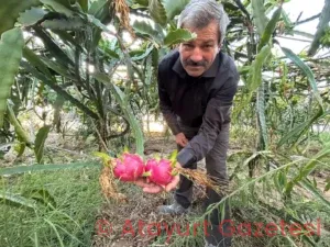 “Bu sera iki dönüm. Önce bir dönümünü ektim, meyvenin verimini güzel görünce kalan bir dönümü de bu yıl kırmızı ejder meyvesi olarak ektim. Şu anda hem beyaz hem de kırmızı türü yetiştiriyorum. Bakımını domates, biber, kavun ya da karpuz gibi yapıyoruz; ilacını, suyunu, gübresini zamanında veriyoruz. Ancak ejder meyvesi soğuğu da sıcağı da sevmeyen bir bitki. Buna rağmen iyi bir ürün alıyoruz. Geçen yıl bir dönümden bir tondan fazla mahsul aldım. Bu yıl dondan ve sıcaktan etkilendi ama yine de verim bekliyorum.”