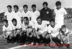 HATAYSPOR’UN 1971-1972 sezonunda kaleci Mehmet Boşnak’ın yanında duran kaptan Naci Tolon bulunuyor.